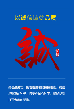 誠信是道路,隨著開拓者的腳步延伸;誠信是智慧,隨著博學者的求索積累;誠信是成功,隨著奮進者的拼搏臨近; 誠信是財富的種子,只要你誠心種下,就能找到打開金庫的鑰匙。